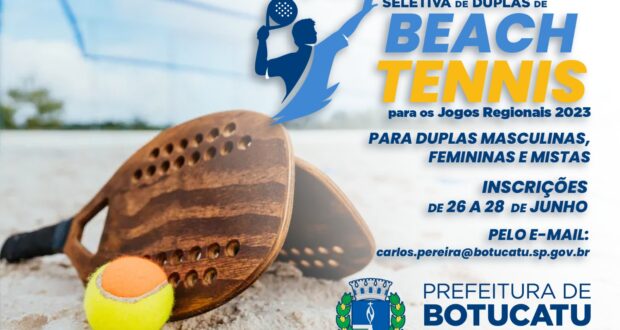 Os Jogos Regionais de 2023, que serão realizados no período de 13 a 23 de julho na cidade de Lençóis Paulista, este ano incluiu a modalidade esportiva extra “BEACH TENNIS”. Por isso, a Secretaria Municipal de Esportes e Promoção da Qualidade de Vida fará uma seletiva de duplas masculina, feminina e mista que representarão Botucatu na competição.
