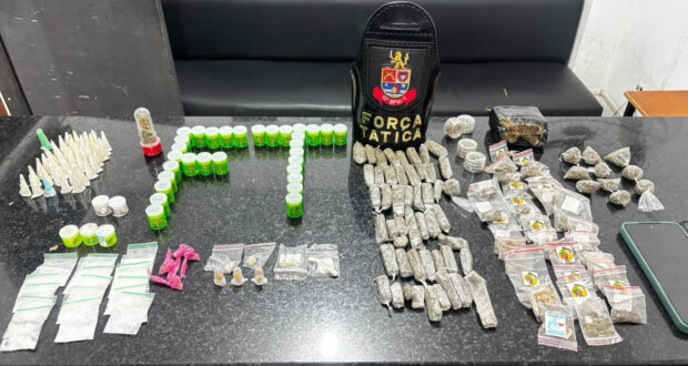 Durante a revista pessoal, foram localizadas duas pedras de crack e dois eppendorfs de cocaína nos bolsos do suspeito. Questionado, ele confessou o crime e apontou uma área de mata onde os policiais localizaram uma sacola com diversas porções de maconha, crack e cocaína, semelhantes às encontradas com o indiciado.
