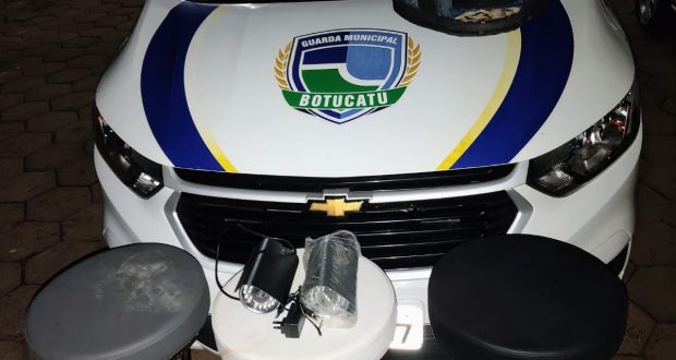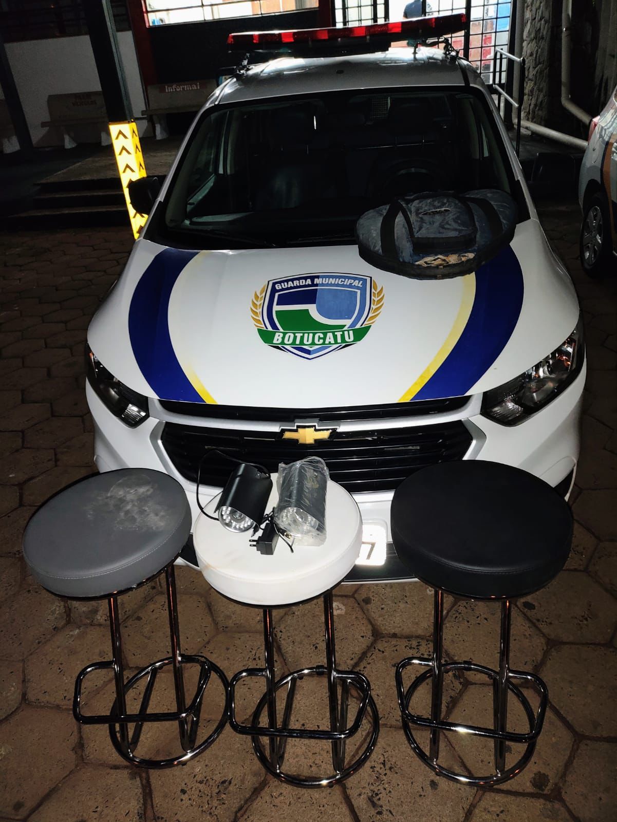 Diante disso foram abordados, porém ambos carregavam 4 banquetas de escritório marca Cavaletti e dentro de uma mochila 2 câmeras de monitoramento marca Intelbras, que foram verificados e possuíam plaquetas de identificação de patrimônio pertencentes a Prefeitura Municipal de Botucatu.