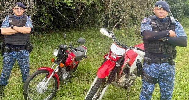 Durante a varredura na vegetação, os agentes localizaram duas motocicletas de cor vermelha. Após consulta aos sistemas policiais, foi confirmado que ambos os veículos haviam sido furtados no dia 26 de janeiro de 2026.