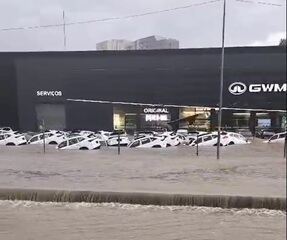 Pelas imagens, é possível ver que vários veículos de marcas caras, além de utilitários – os chamados SUV – foram tragados pelo temporal e ficaram boiando na porta da loja durante a tempestade.