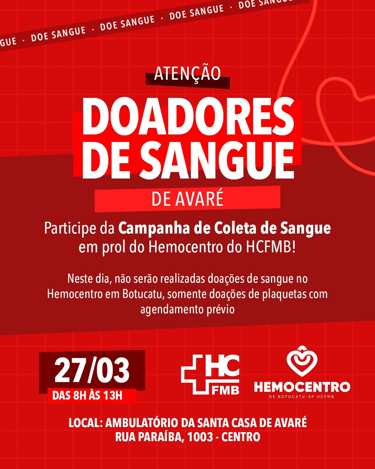 Nesta quinta-feira, 27, das 8h às 13h, o Hemocentro do Hospital das Clínicas da Faculdade de Medicina de Botucatu – Unesp (HCFMB) realizará uma coleta externa de sangue em Avaré. Neste dia, não serão realizadas doações de sangue no Hemocentro; haverá apenas doações de plaquetas com agendamento prévio.