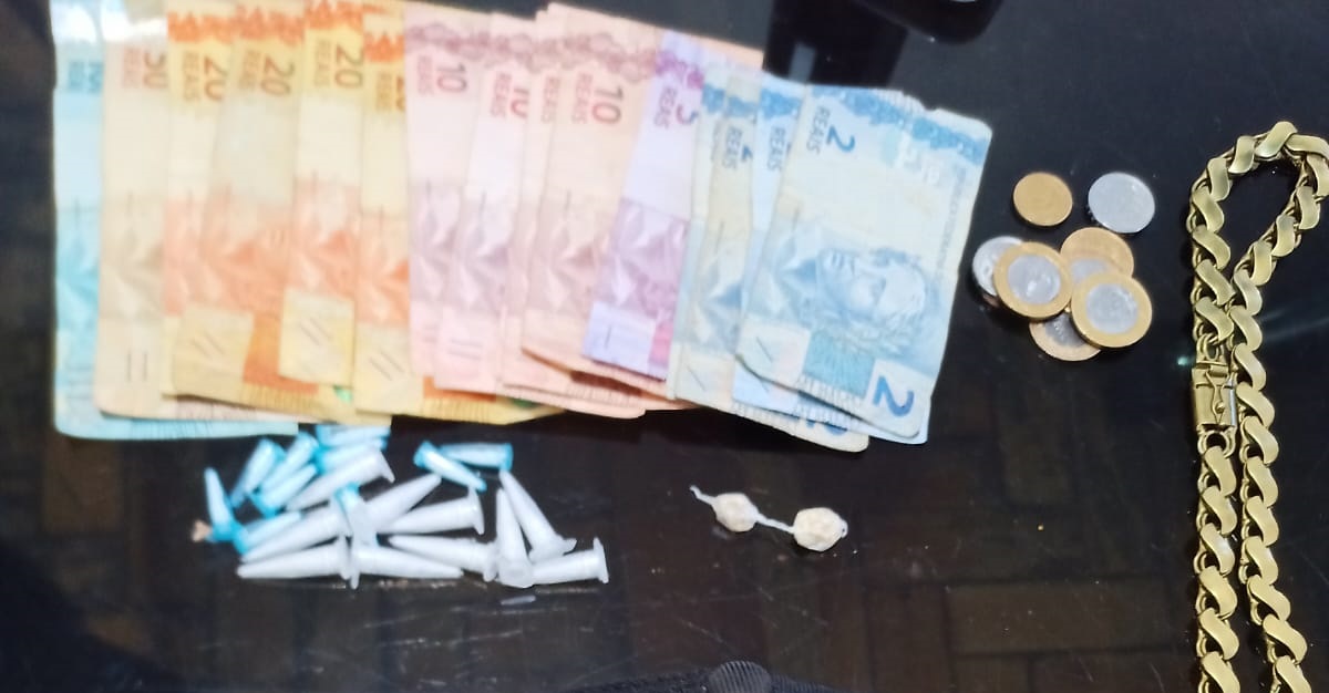 Com apoio da Polícia Militar, a abordagem foi realizada imediatamente. No local indicado, os policiais localizaram a sacola, que continha 20 pinos de cocaína, duas pedras de crack e R$ 298 em dinheiro trocado — indício claro da comercialização das substâncias.