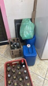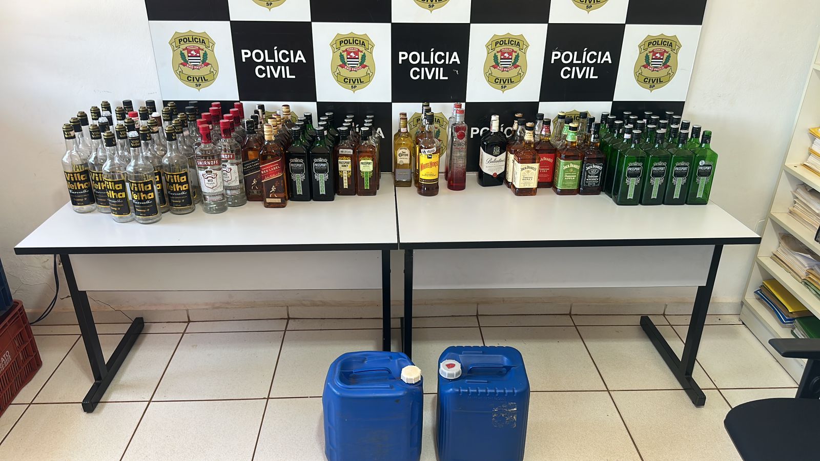 No interior do comércio, também foram encontradas diversas garrafas vazias das marcas Passaport e Velho Barreiro, ao lado de galões de cachaça, o que reforçou a suspeita de reenvase de bebidas de menor valor em garrafas de marcas conhecidas.