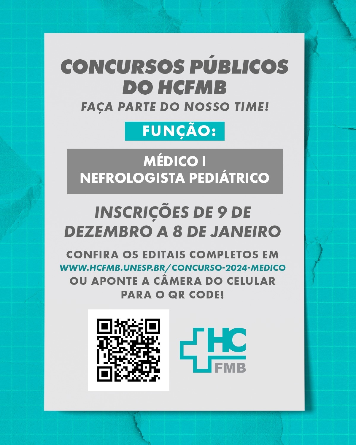 As inscrições poderão ser realizadas a partir da próxima segunda-feira, 9 de dezembro, até às 23h59 do dia 8 de janeiro de 2025, pelo site https://www.hcfmb.unesp.br/concurso-2024-medico, em que está disponível o edital completo do cargo. A taxa de inscrição é de R$ 116,69.