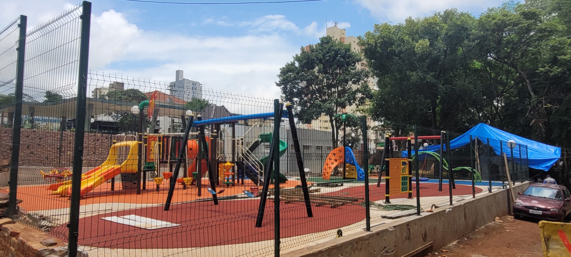 Segurança reforçada: para garantir a segurança de todos, a área do parque é totalmente cercada com alambrado, contendo intervenções visuais lúdicas que estimulam a imaginação.