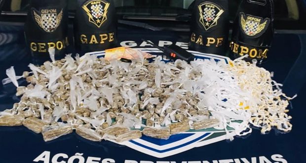 Na outra sacola que estava em sua posse, havia 216 porções de substância análogas a cocaína e 378 de crack, além da importância de R$ 100,00, oriundas de vendas anteriores no bolso da calça e um rádio comunicador.
