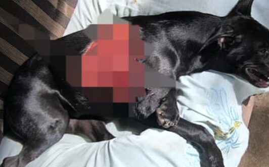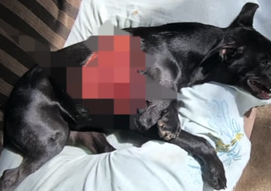 Ao chegarem ao local, os policiais encontraram um cão deitado sobre um sofá, com um ferimento extenso e profundo na região abdominal, que poderia ter sido produzido por um instrumento cortante.