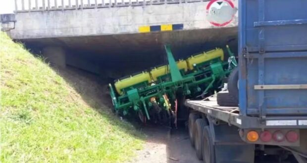 Uma máquina agrícola caiu de uma carreta na manhã desta terça-feira (24) na Rodovia Castello Branco (SP-280), em Itatinga (SP), no km 233.
