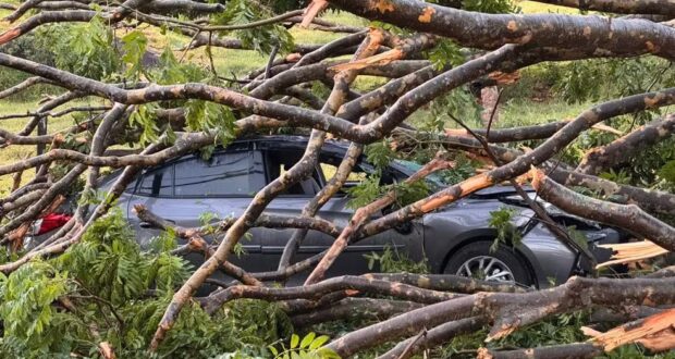 Na manhã desta terça-feira (9), equipes da prefeitura e da CPFL Piratininga trabalharam para retirar a árvore que caiu em cima do carro da família. Galhos, poste e fiação elétrica atingiram o veículo.
