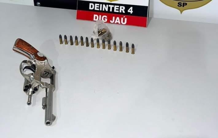 Afim de elucidar um crime de extorsão, a DIG de Jaú prendeu um jovem de 24 anos com um revólver calibre .22 e 14 munições intactas.