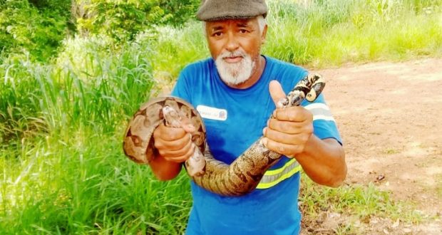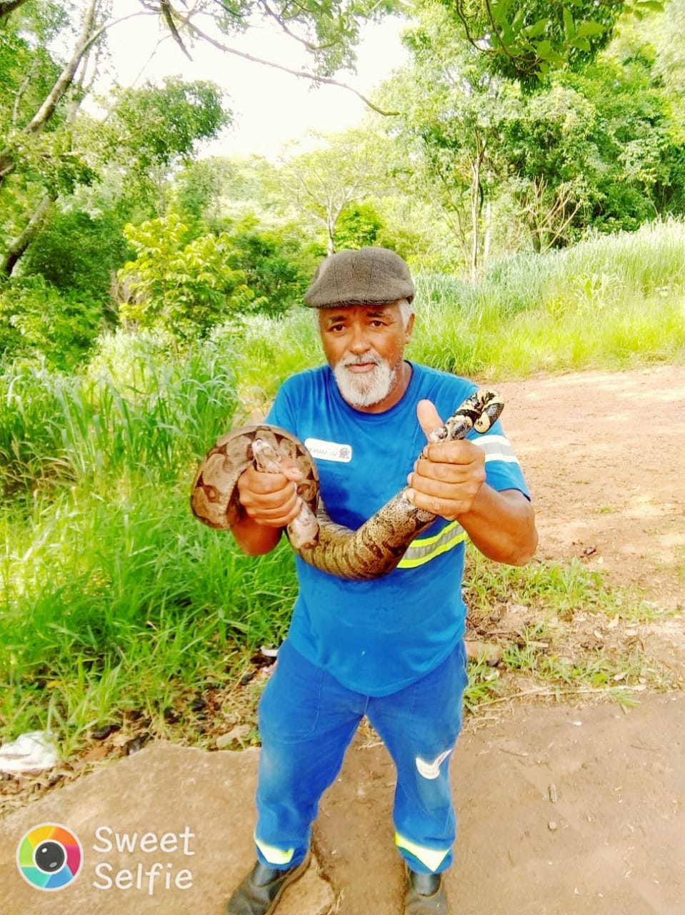 Funcionários da prefeitura que trabalham no Horto próximo ao viaduto da linha férrea na Vila São Geraldo em São Manuel localizaram a Jiboia de aproximadamente 2 metros.
