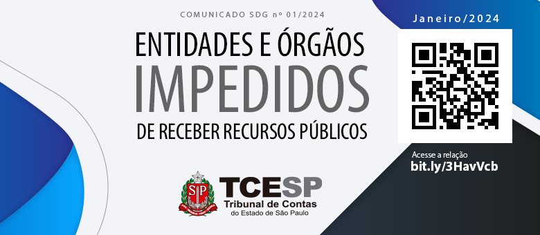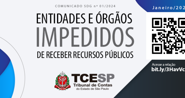 O Tribunal de Contas do Estado de São Paulo (TCESP) divulgou, por meio do Comunicado n.º 01/2024 da Secretaria-Diretoria Geral (SDG), a relação de órgãos ou entidades que, de acordo com o disposto no artigo 103 da Lei Complementar 709/93, estão proibidos de novos recebimentos de auxílios, subvenções ou contribuições do Estado ou dos Municípios.
