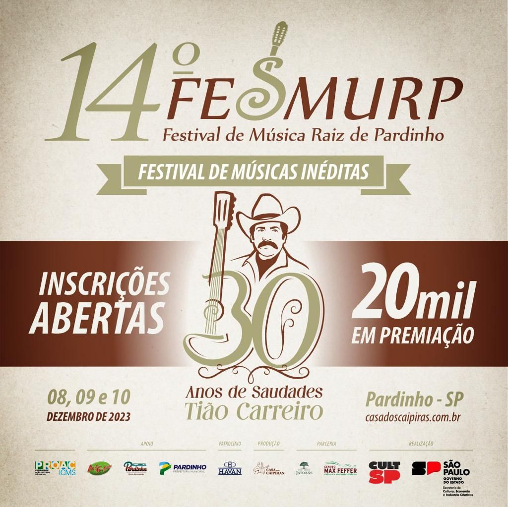Em 1993, o Brasil se despediu de uma de suas maiores lendas da música caipira: o lendário Tião Carreiro. Três décadas após a sua partida, o Centro Cultural Max Feffer, em Pardinho, será palco do tradicional FESMURP (Festival de Música Raiz de Pardinho). O evento está programado para os dias 8, 9 e 10 de dezembro e terá um prêmio de R$ 20 mil em dinheiro.