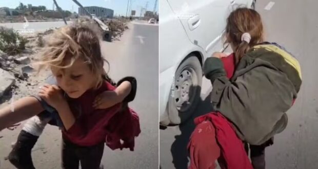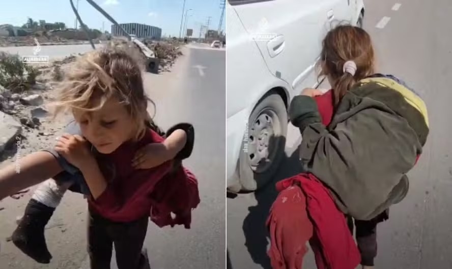 O vídeo de uma menina carregando a irmã mais nova nas costas se tornou viral na internet desde que foi publicado nesta segunda-feira. As imagens mostram a criança caminhando descalça na estrada sob um sol escaldante na Faixa de Gaza.