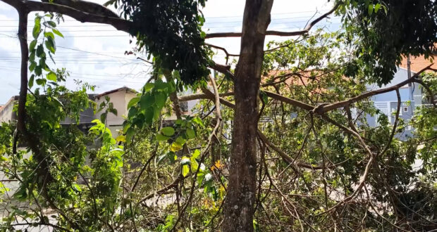 No ponto onde ocorreu a queda, foi possível observar um corte anterior no tronco e a ausência de resíduos que indicassem quebra natural recente, reforçando a suspeita de fragilidade estrutural causada por intervenções inadequadas. Além disso, moradores relatam que outros galhos continuam se partindo com frequência, aumentando o risco para quem circula pela área.