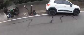 As imagens mostram um veículo Renault Kwid branco tentando forçar uma ultrapassagem entre várias motocicletas. Em determinado momento, o carro bate lateralmente com uma delas, fazendo com que a motocicleta Kawasaki tombasse na faixa de rolamento e levando o motociclista ao chão.