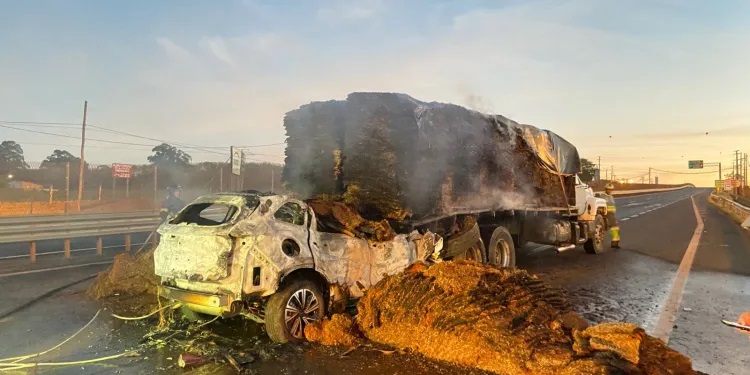 Com o impacto, o carro pegou fogo. O incêndio consumiu totalmente o automóvel e parte da carreta do caminhão, que estava carregada com grama. O condutor do carro morreu carbonizado no local.