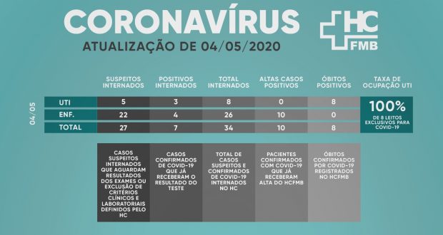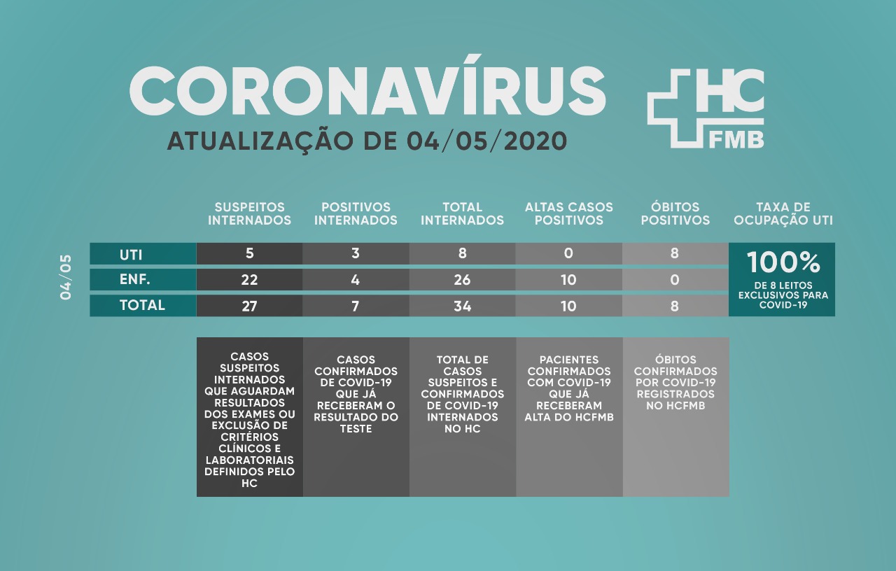 Sendo assim, o HCFMB tem até a data de hoje 8 leitos de UTI para o tratamento de casos de COVID-19 e, a partir de hoje, passará a divulgar diariamente sua taxa de ocupação, conforme tabela em anexo.