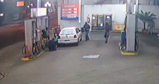 Os assaltantes como mostram as imagens usaram de violência abordando o frentista do posto e os ocupantes do veiculo. Os suspeitos levaram o veiculo e pertences das vítima que estavam no veículo.