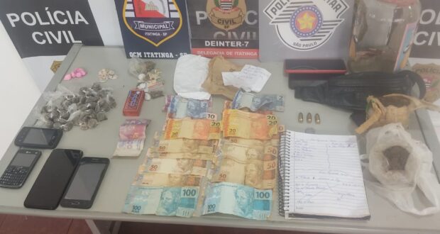 Na residência 3, foram localizados 1 porção grande de maconha, 1 tablete pequeno de maconha, R$891,50 em espécie, 3 munições de calibre .40, e 2 aparelhos celulares.