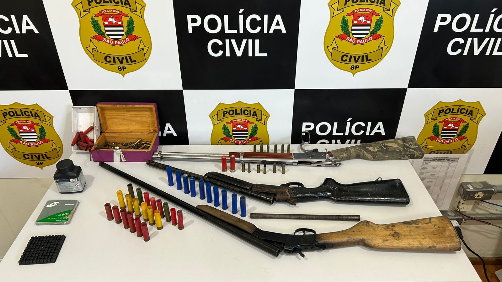 Durante as buscas, os policiais apreenderam três espingardas — uma delas com numeração adulterada —, grande quantidade de munições e projéteis, além de simulacros de armas longas e pistolas.