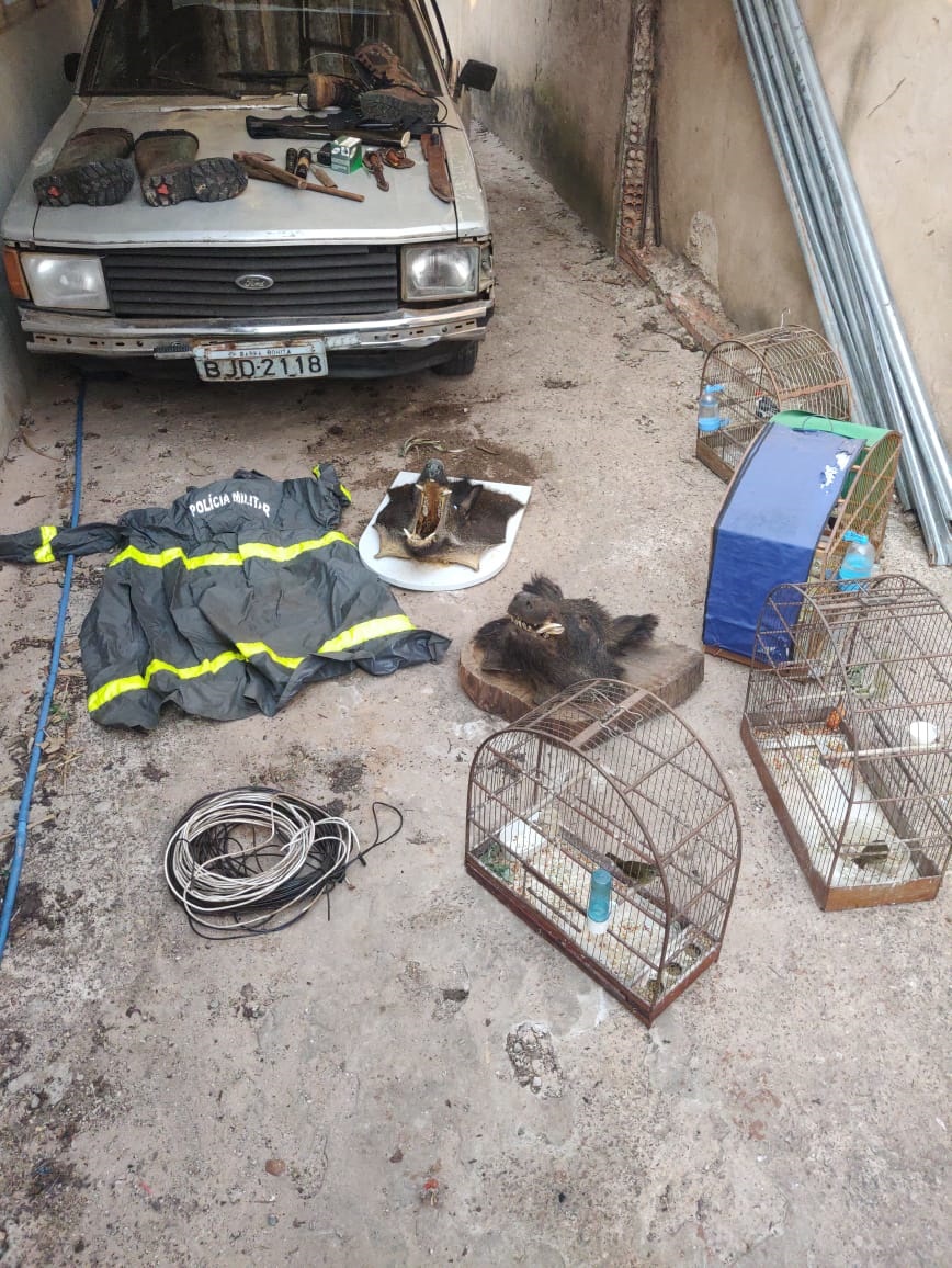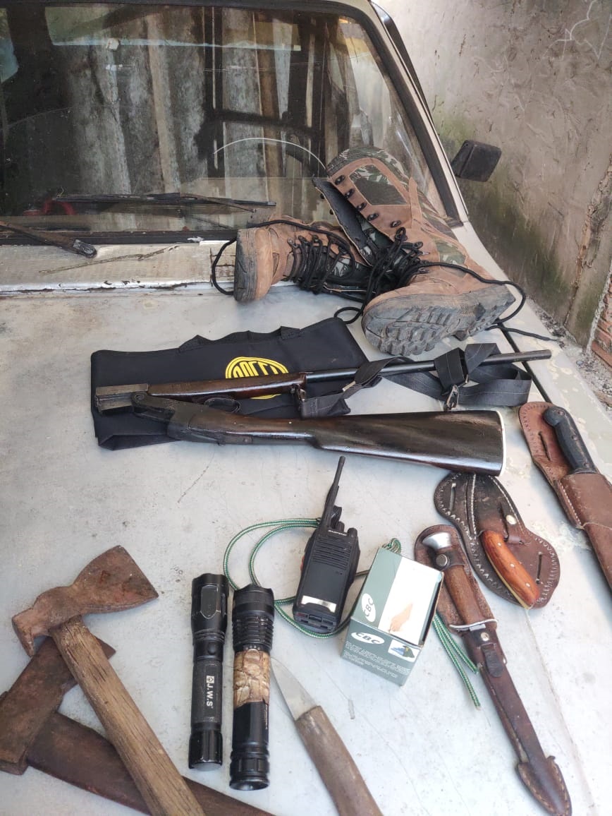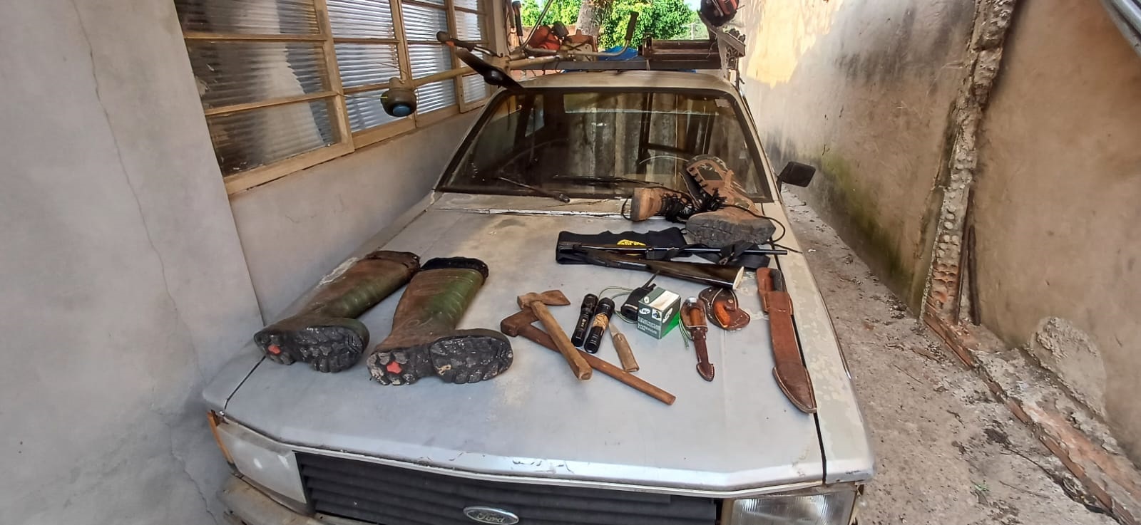 No local os policiais prenderam em flagrante delito o investigado pelos crimes citados, nas buscas realizadas em sua residência foi encontrado uma arma de fogo tipo espingarda, quatorze munições calibre 32, um facão, duas facas, três machadinhas, capas e coletes para a prática de caça.
