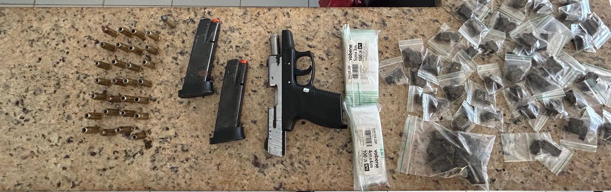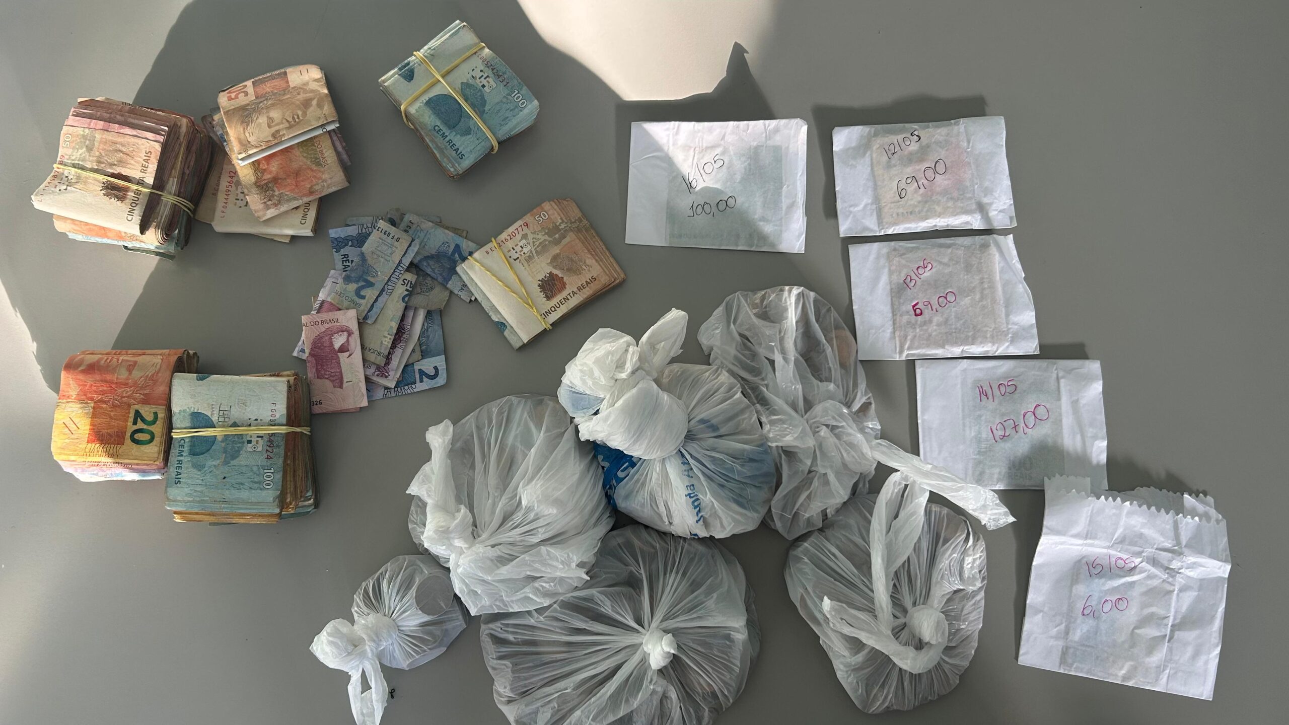 Os policiais também apreenderam uma pistola calibre .40 com numeração suprimida, munições do mesmo calibre e de calibre .38, além de R$ 27.990,20 em espécie. Documentos encontrados nos locais vinculam os imóveis aos suspeitos e indicam a compra de diversos bens na localidade, sugerindo possível prática de lavagem de dinheiro proveniente do tráfico.