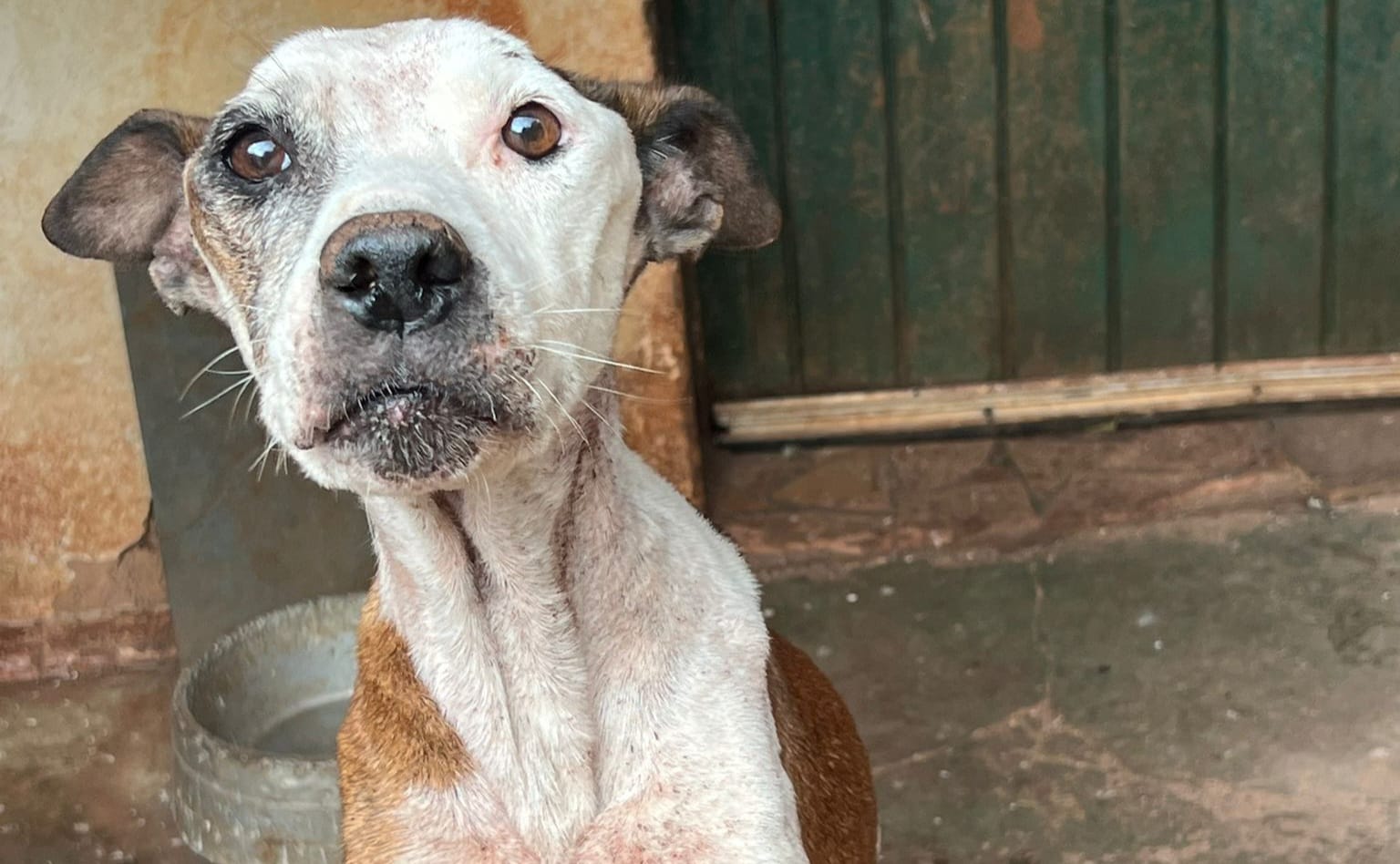 A fêmea com magreza extrema e tumor de mama com bicheira. O cão macho também apresentava magreza e mioclonia, provavelmente por cinomose.