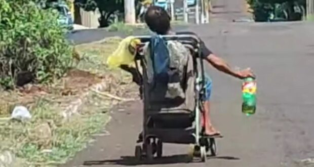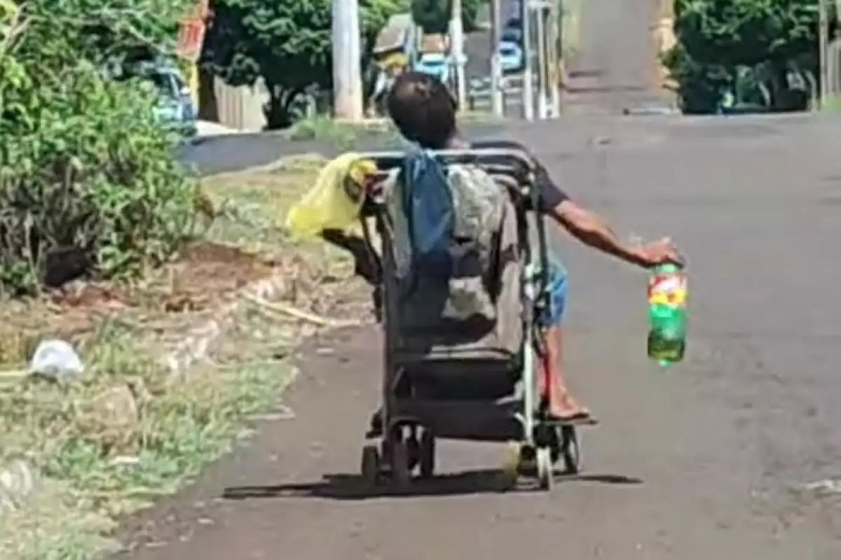 Um homem desceu um rua em Orlândia, sentado em um carrinho de bebê. Não há informações de quando aconteceu, mas o inusitado vídeo viralizou nas redes sociais nesta segunda-feira, 18.
