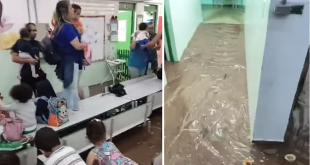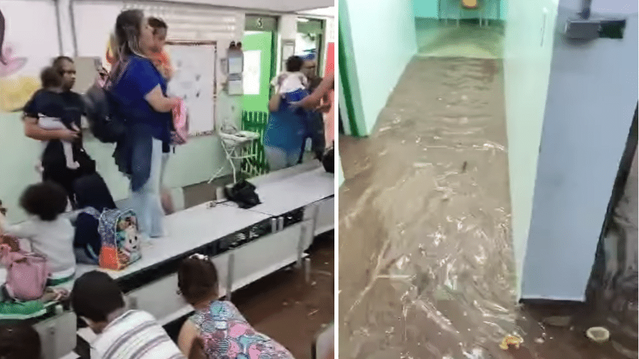 Nas imagens, é possível ver a hora que a água entra no local e o desespero dos funcionários e das crianças.