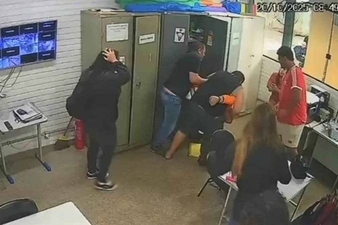 Imagens mostram o momento em que um professor da unidade é agredido com socos e chutes pelo pai de aluna dentro da sala da coordenação de uma escola pública do Guará. O motivo da agressão, segundo as versões colhidas pela Polícia Militar do Distrito Federal (PMDF), teria sido uma repreensão feita pelo educador à estudante, que usava o celular de forma indevida em sala de aula. O episódio só terminou com a intervenção da própria filha do agressor, que o conteve com um mata-leão.