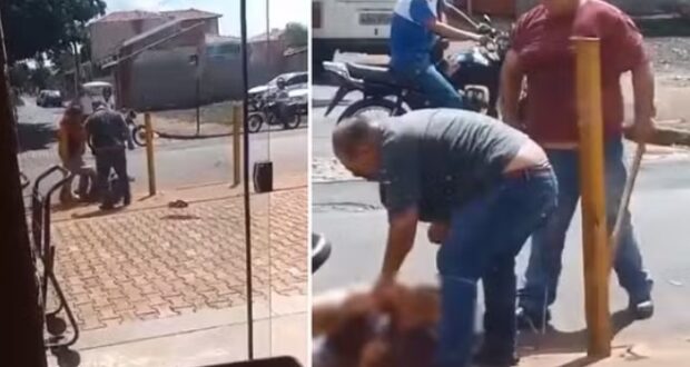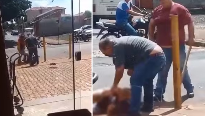 Um vídeo que circula nas redes sociais mostra o momento das agressões. Nas imagens, os suspeitos de 51 e 28 anos aparecem segurando uma faca e um pedaço de madeira enquanto a vítima aparece jogada na calçada.
