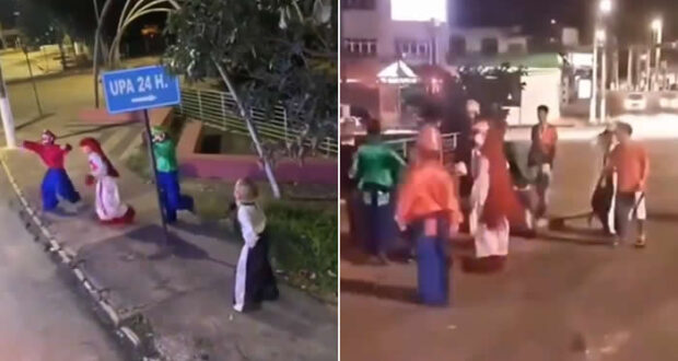 Todos os personagens começam a dançar juntos na apresentação para o público das carretas, até que o intérprete do “Chaves” inicia o confronto com Luigi, do “Super Mario Bros”. A confusão se generaliza quando outros intérpretes começam a trocar socos e chutes.