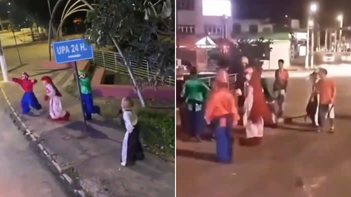 As imagens mostram o momento em que quatro dos personagens de uma das carretas dançam em direção a um cruzamento em Pará de Minas, na última quarta-feira (20).