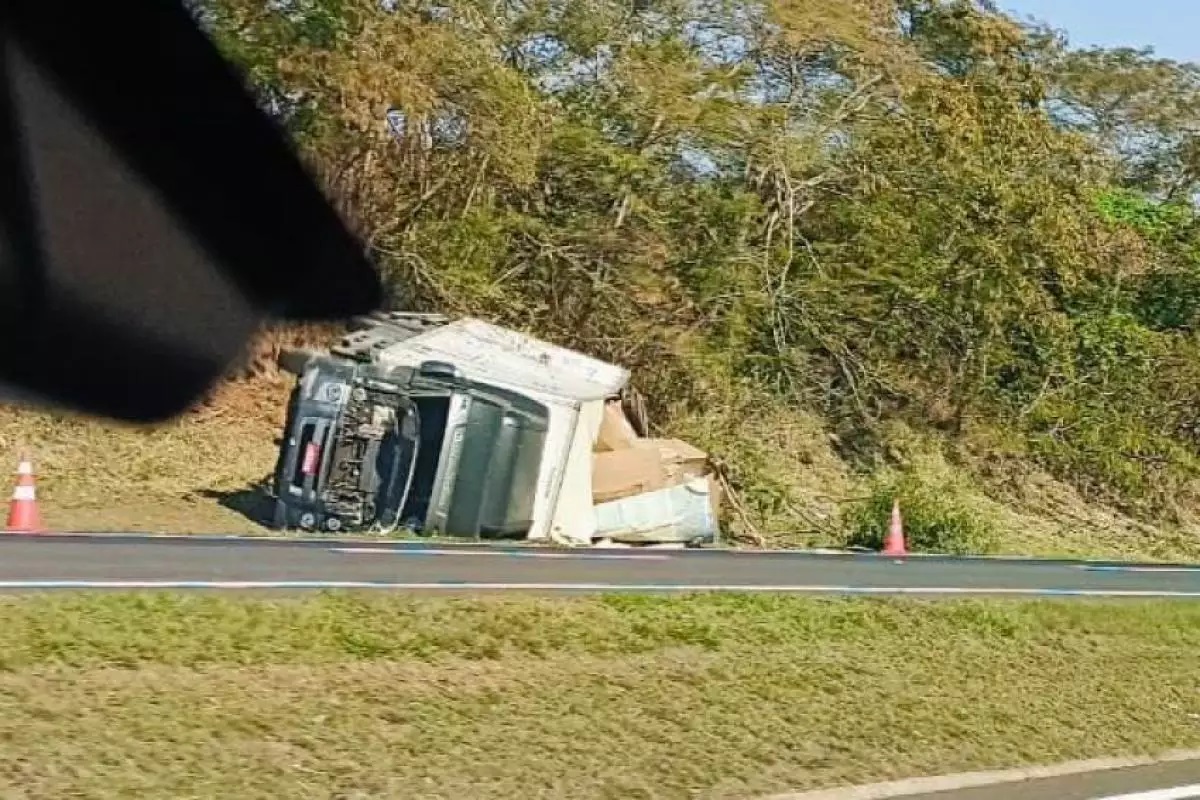 Um caminhão-baú Volkswagen Constellation tombou, nesta sexta-feira (19), e espalhou parte da carga de garrafas recicladas no acostamento do quilômetro 220 da rodovia Comandante João Ribeiro de Barros (SP-225), a Bauru-Jaú, em Pederneiras.