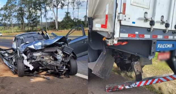 Um carro ficou totalmente destruído após bater na traseira de uma carreta, na tarde de terça-feira (14), na Rodovia Comandante João Ribeiro de Barros, a SP-225, em Pederneiras (SP). O motorista do veículo disse ter cochilado ao volante.