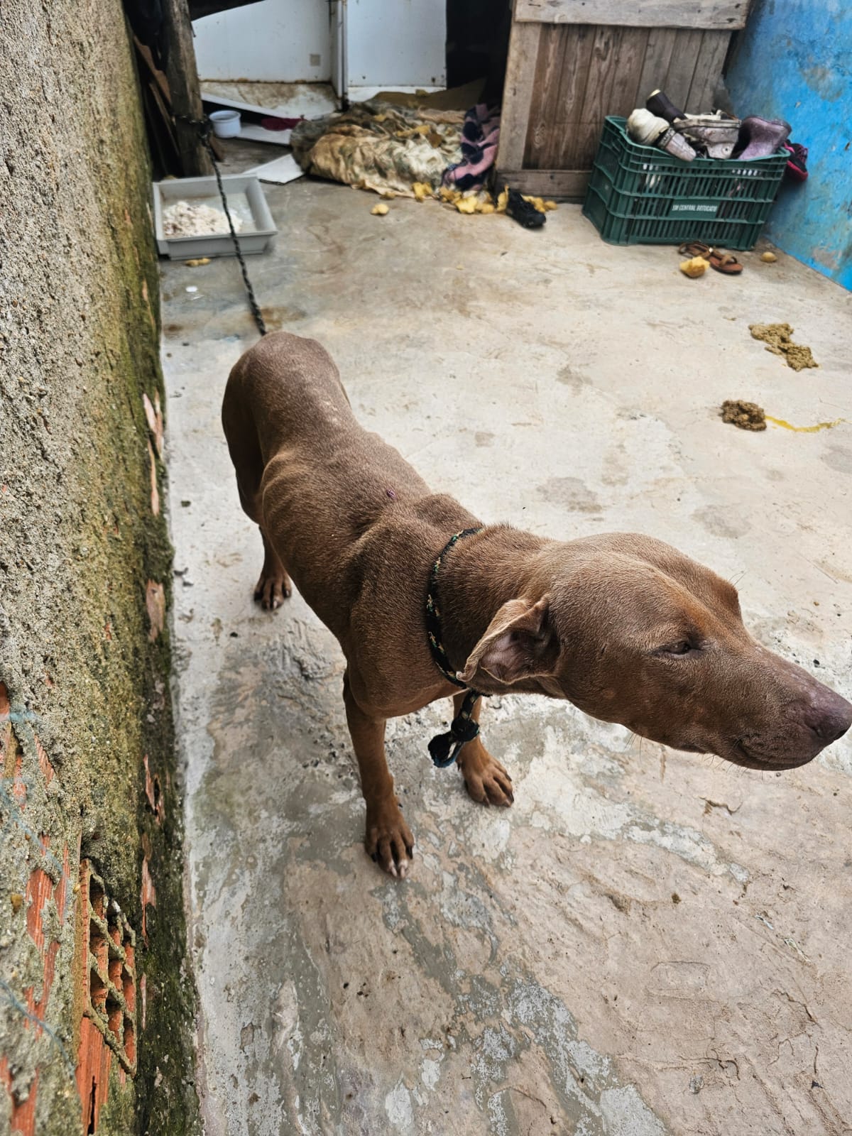 Na ação de hoje o cão estava em contenção curta, em meio as próprias fezes, com alimentação deteriorada e sem cuidados médicos veterinários. O tutor, um homem, foi conduzido para a Delegacia de Polícia onde foi dada voz de prisão por crime de maus tratos.