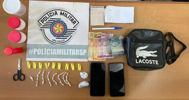Durante o patrulhamento preventivo, os militares desconfiaram do comportamento de um casal que estava na via pública, e ao ser realizada a abordagem, foram localizados os seguintes produtos do tráfico de drogas: 18 porções de cocaína, 35 de crack e 02 de maconha, 02 aparelhos celulares, além de R$389,00 em espécie.