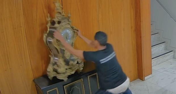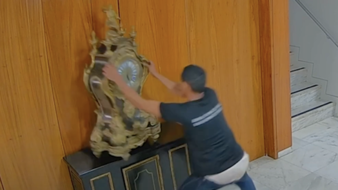 O relógio foi um presente da França ao então rei dom João 6º e estava no 3º andar do Palácio do Planalto. Câmeras de segurança flagraram o momento em que o homem destruiu o objeto. Nas imagens, ele vem caminhando, para, derruba o relógio no chão e revira mesas e cadeiras. Depois, retorna e tenta destruir a câmera de segurança com um extintor de incêndio.