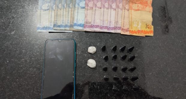 Foi localizada com eles 19 porções de cocaína, 02 de maconha, 01 aparelho celular e R$ 69,00 em espécie.