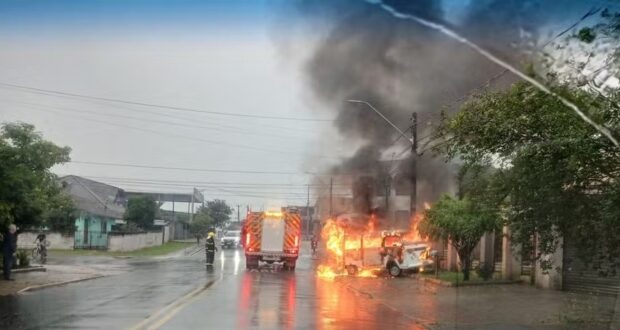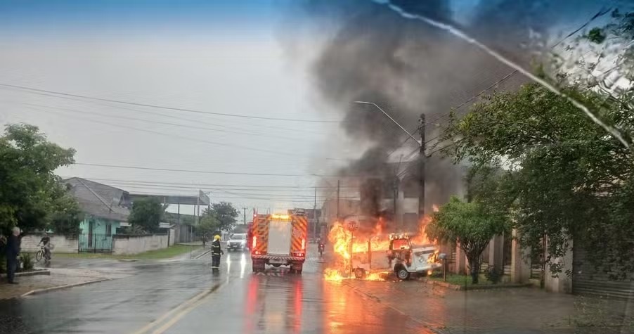 Uma Kombi em chamas foi flagrada andando sozinha em Porto União, no Norte de Santa Catarina, na quarta-feira (10). As imagens mostram o momento em que o veículo cruzou uma esquina da cidade sem condutor e tomado pelo fogo.