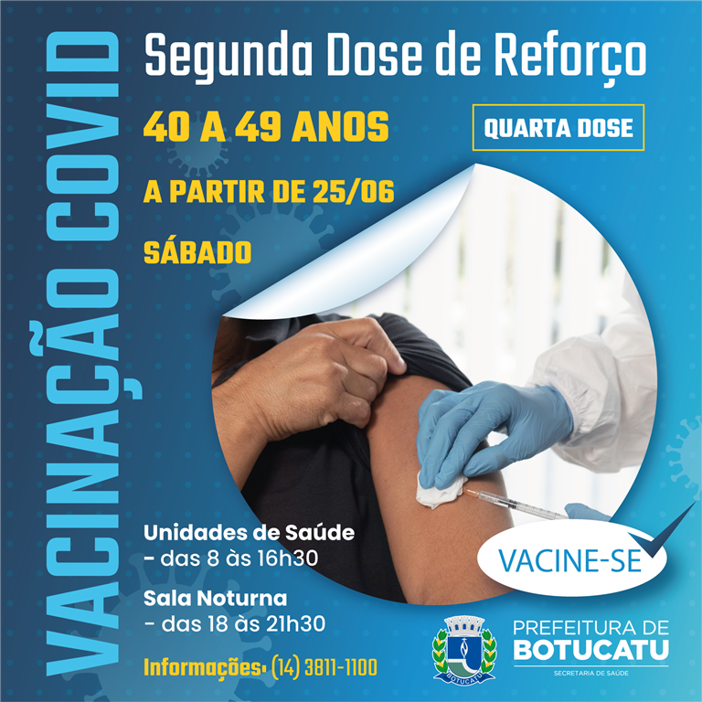 Neste sábado, 25, todas as unidades de saúde de Botucatu estarão abertas das 8 às 16 horas para vacinar com a segunda dose de reforço (4ª dose) contra a Covid-19 pessoas entre 40 e 49 anos.