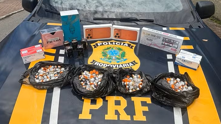 Na vistoria do carro, os policiais encontraram cinco frascos de anabolizantes, 160 frascos de medicamentos para emagrecimento, seis caixas de remédio para disfunção erétil, além de dois celulares e dois perfumes importados. Parte dos produtos exigia armazenamento refrigerado, mas era transportada de maneira inadequada.