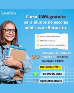 O Projeto Astralis 2026 está com inscrições abertas para estudantes de escolas públicas de Botucatu que sonham em conquistar uma vaga no concorrido Colégio Embraer e no Colégio Técnico Industrial (ETEC). A iniciativa oferece preparação totalmente gratuita e inclusiva, com foco em alunos do 9º ano do Ensino Fundamental que apresentem bom desempenho escolar e alta motivação para o estudo. Ao todo, serão disponibilizadas apenas 15 vagas.