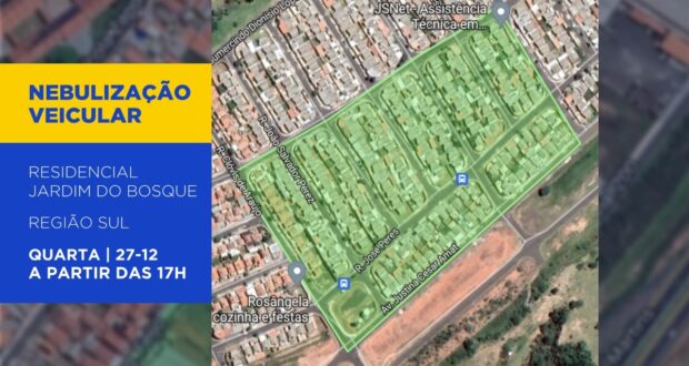 A Vigilância Ambiental em Saúde realizará na tarde desta terça-feira, 27, a atividade de nebulização veicular em quarteirões do Residencial Jardim do Bosque, conforme mapa. A ação terá início às 17h com término previsto para 19h30. Em caso de chuva ou ventos acima de 10 km/h, a ação será realizada no próximo dia em que as condições climáticas forem favoráveis