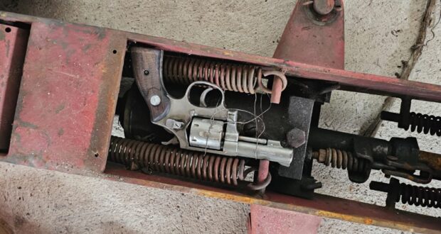 Acompanhado pelos policiais, o indiciado indicou o local onde o revólver estava guardado. Ele estava no interior de um macaco hidráulico, modelo “jacaré”, na garagem do imóvel. Diante dos fatos, foi dada voz de prisão ao mesmo pelo crime de posse de arma de fogo com numeração suprimida. O indiciado foi conduzido a esta unidade policial para as providências cabíveis, e os fatos serão utilizados para instrução de Inquérito Policial.