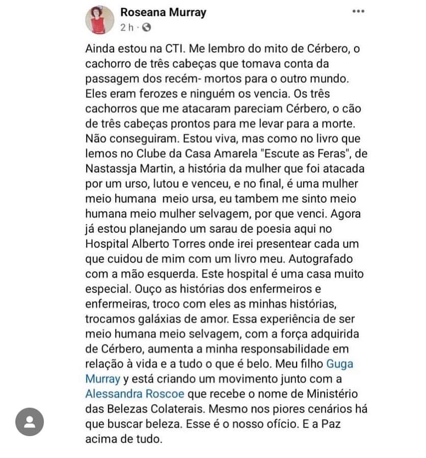 A escritora Roseana Murray que foi atacada por três cães quando saía de casa sai da UTI e fala às suas redes sociais sobre a emoção de estar viva dando um exemplo lindo de superação. Confira no texto abaixo.