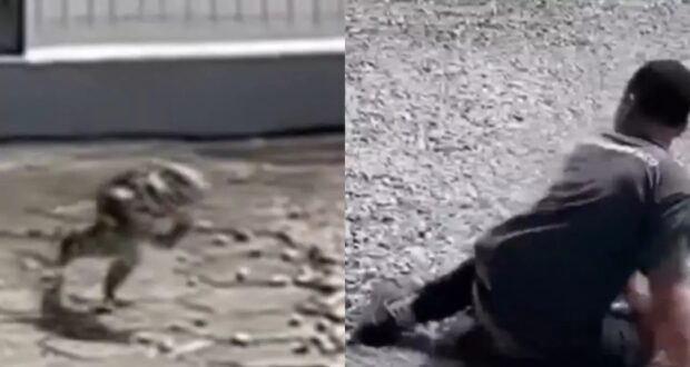 O jovem que caiu ao tentar correr de um lagarto teiú após jogar pedras contra o réptil para tentar espanta-lo enquanto era filmado por colegas de trabalho em Guaramirim, Santa Catarina, conta que quem acabou afugentado, e no prejuízo, foi ele mesmo.