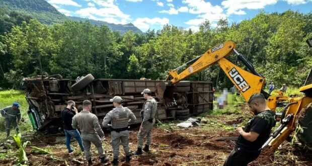 Um ônibus que transportava estudantes e professores do Colégio Politécnico da Universidade Federal de Santa Maria (UFSM) tombou em uma ribanceira na RSC-453, em Imigrante (RS), na manhã desta sexta-feira (4). O acidente fez sete mortos — seis mulheres e um homem — e ao menos 22 feridos, segundo o Corpo de Bombeiros voluntários da cidade, Caroline Hauschild.